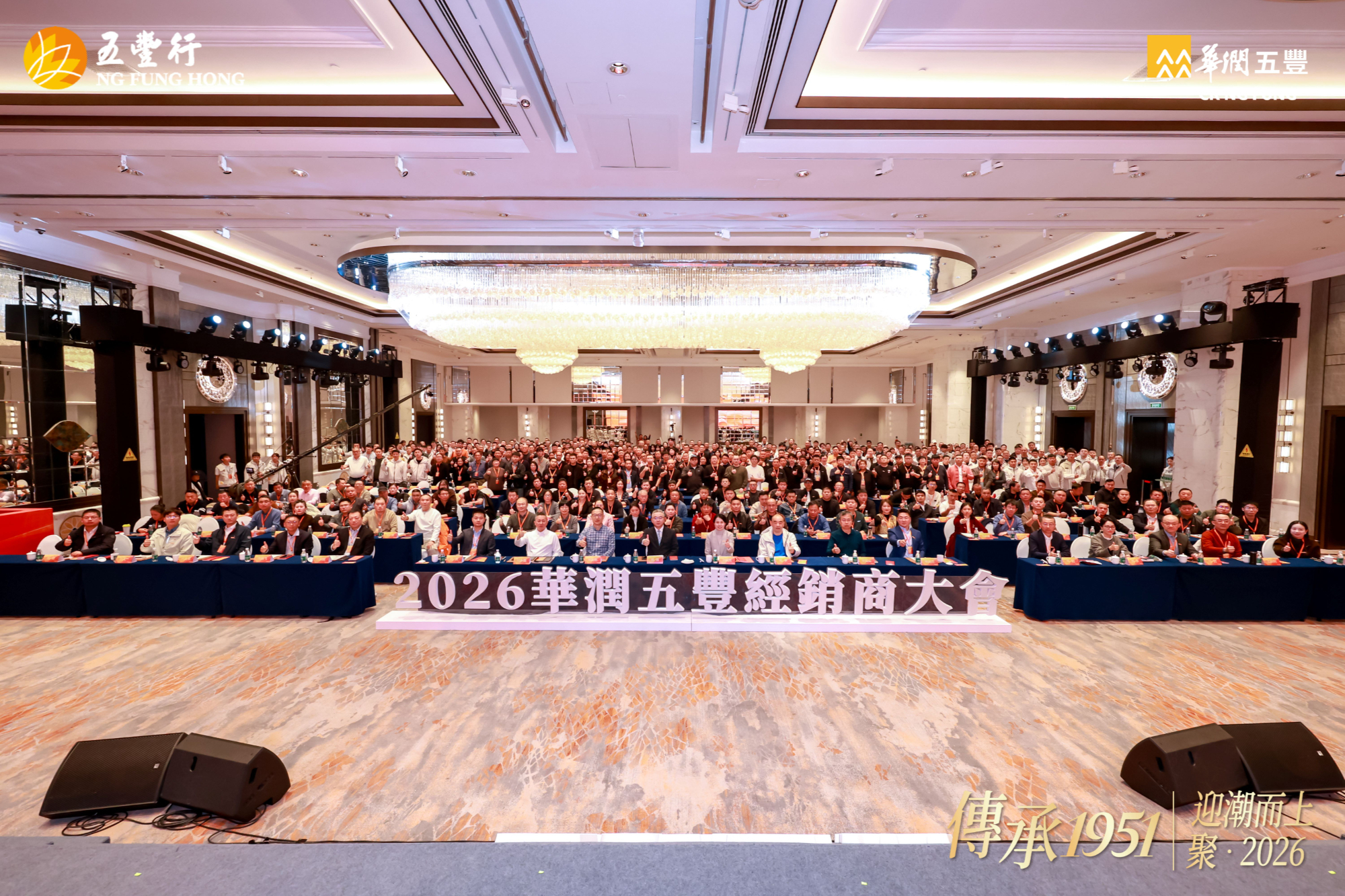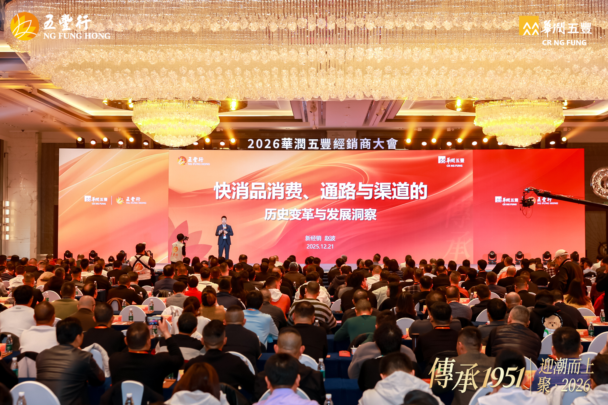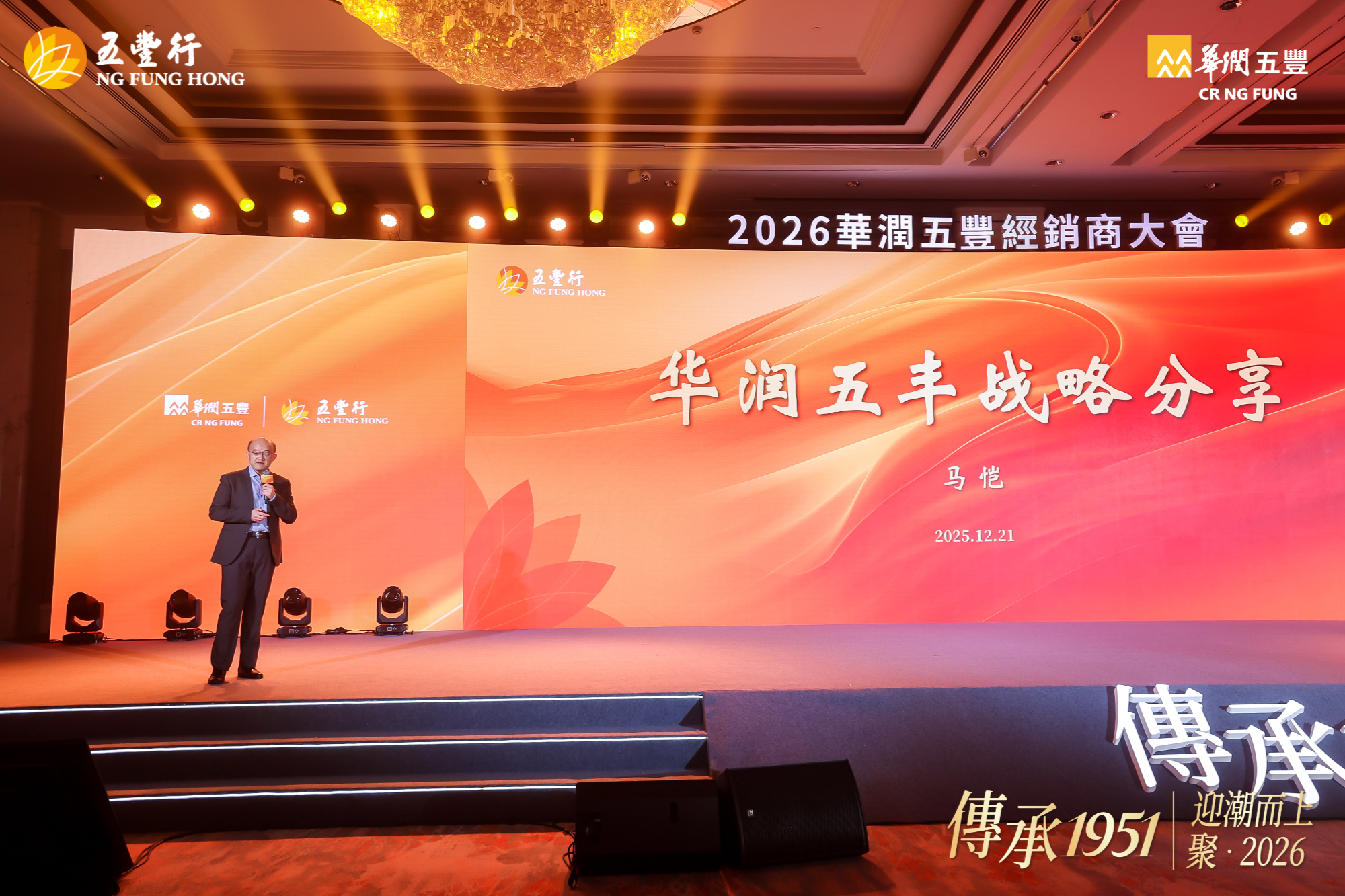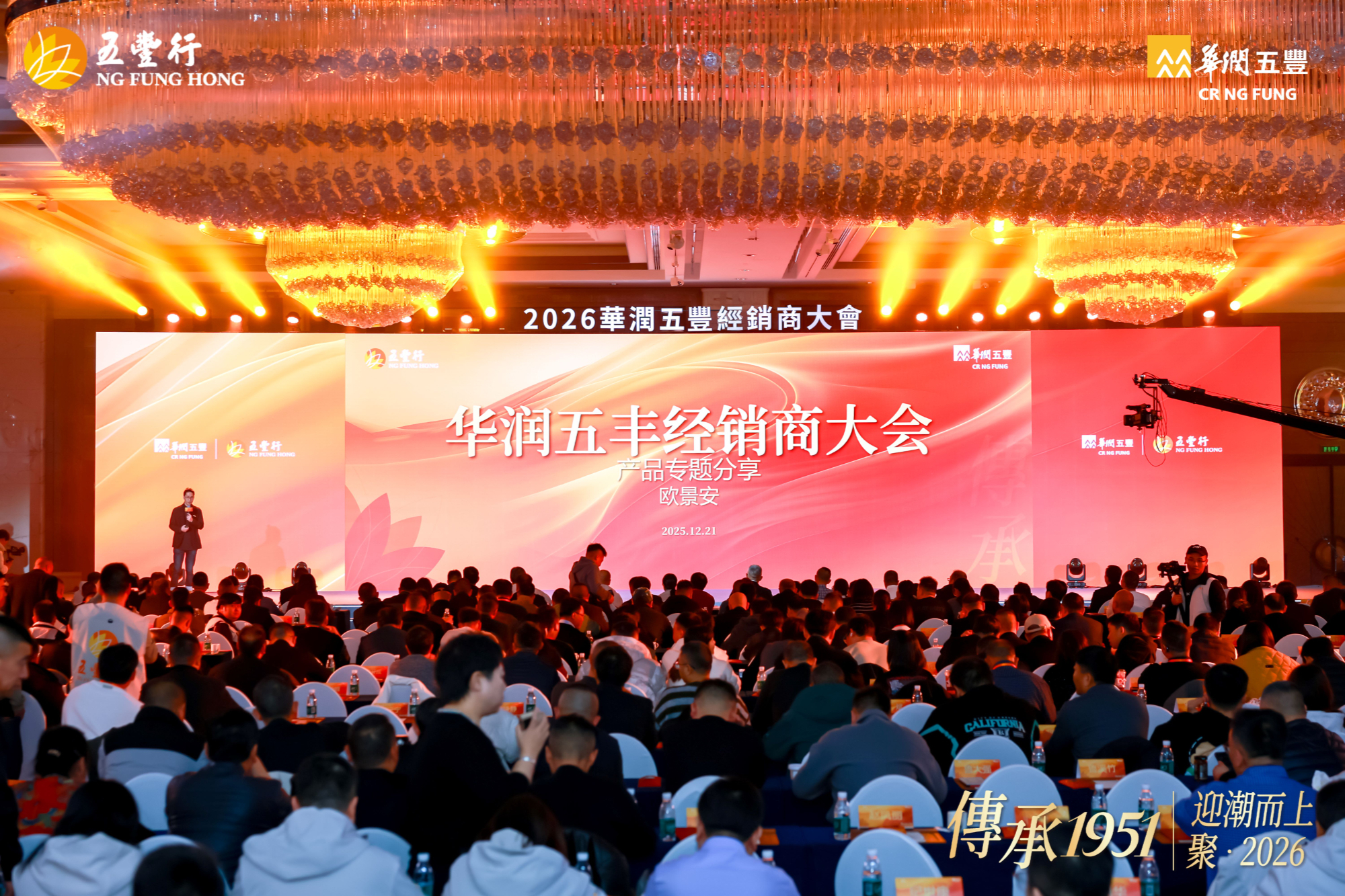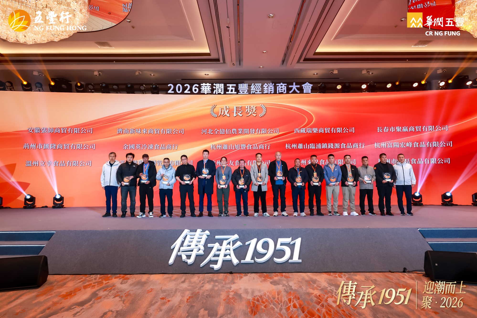 12 月 21 日,华润五丰在杭州召开 2026 年经销商大会,大会以 “传承 1951 丨迎潮而上,聚 2026” 为主题,寓意华润五丰与各经销商伙伴一起顺势而为、聚力同心,共拓食品行业新征程。华润五丰董事长原强、总经理刘明芳携管理团队,以及来自全国各地的经销商伙伴等,共计 450 余名嘉宾参加活动。
