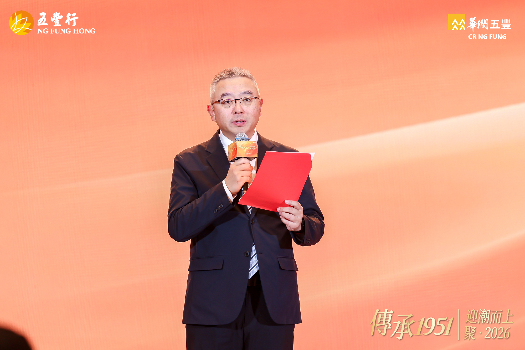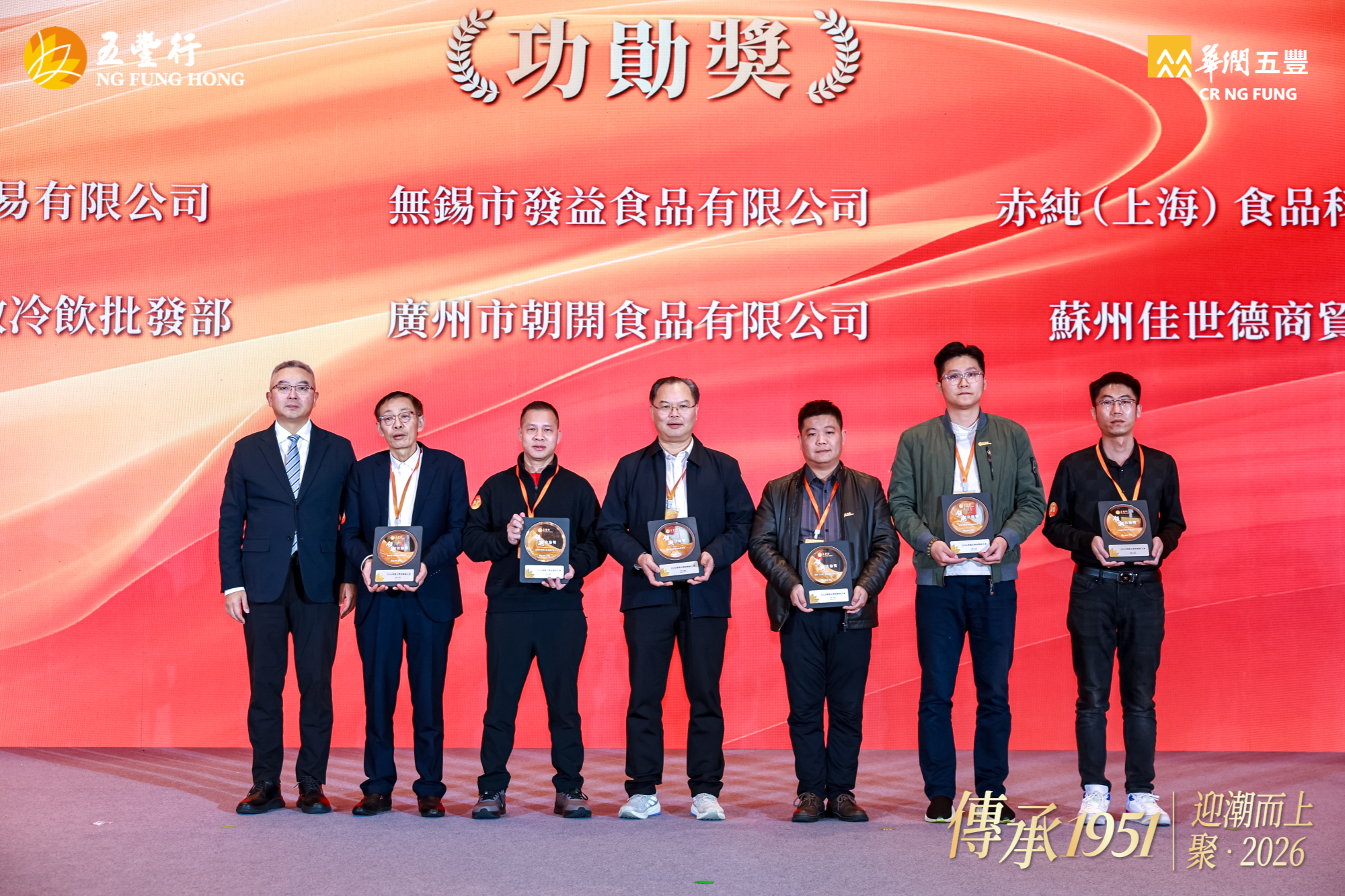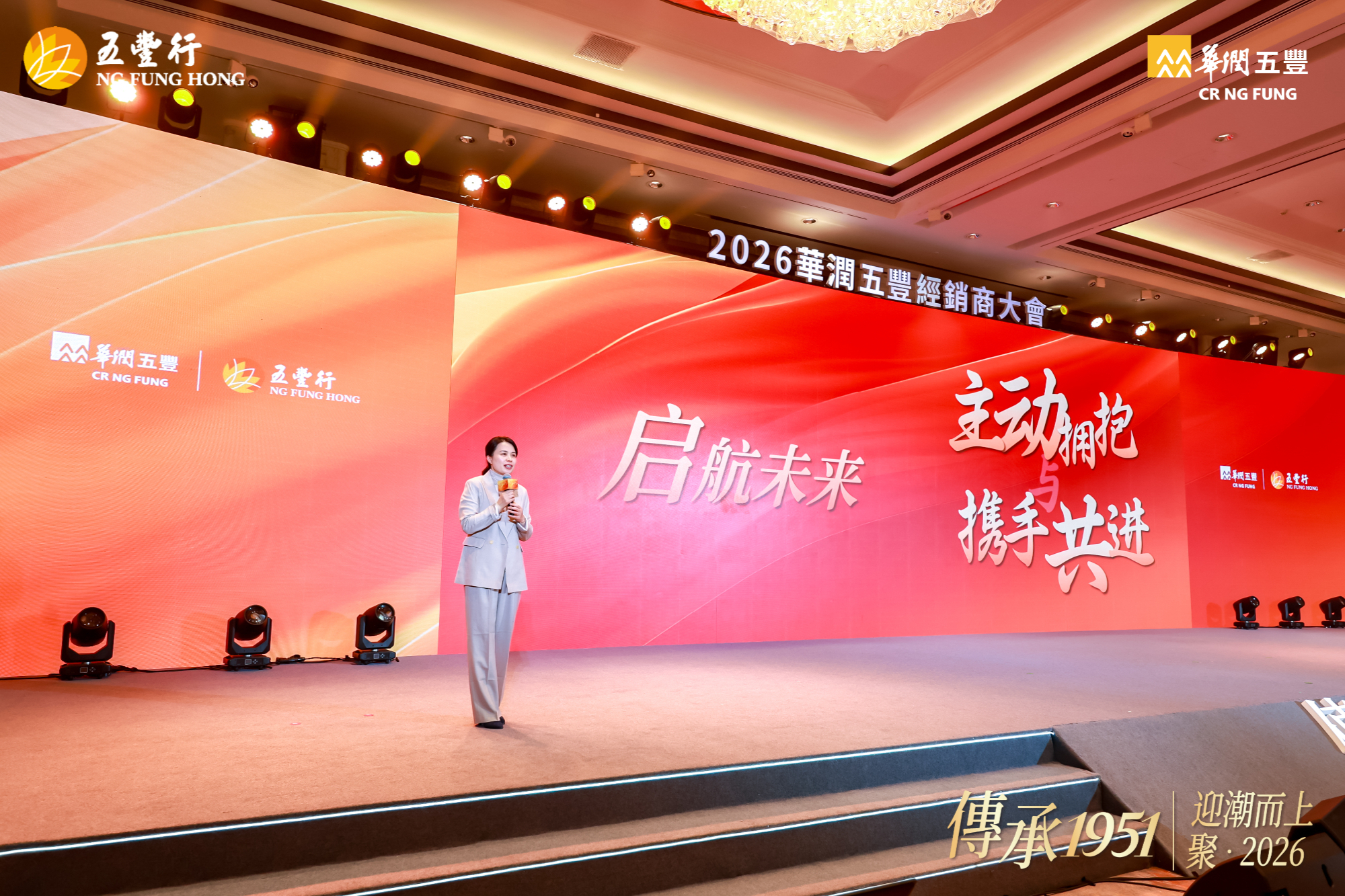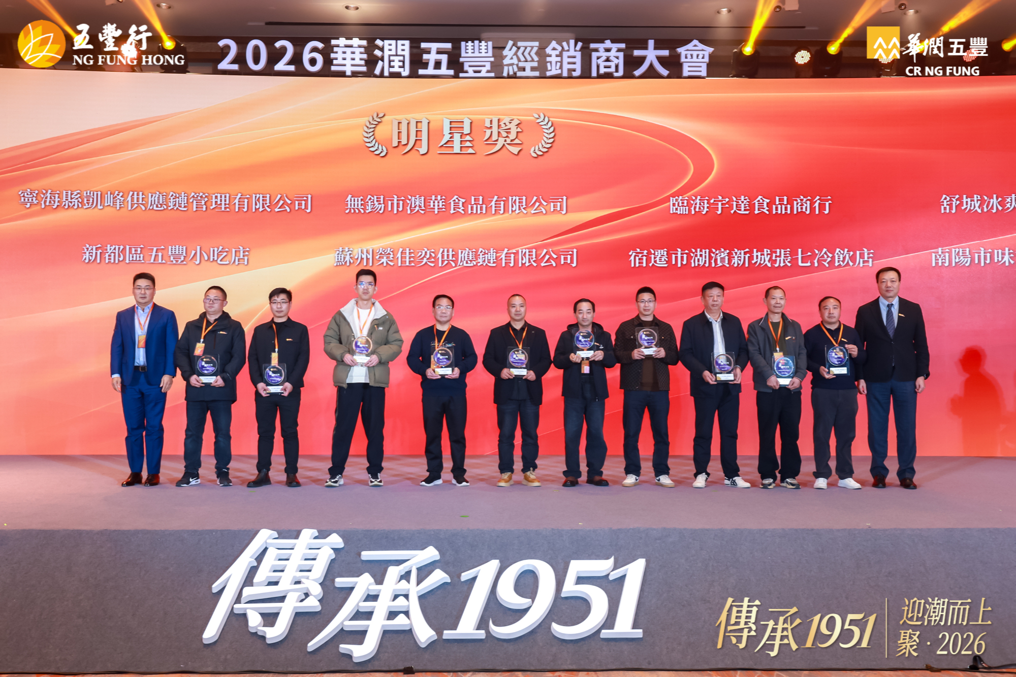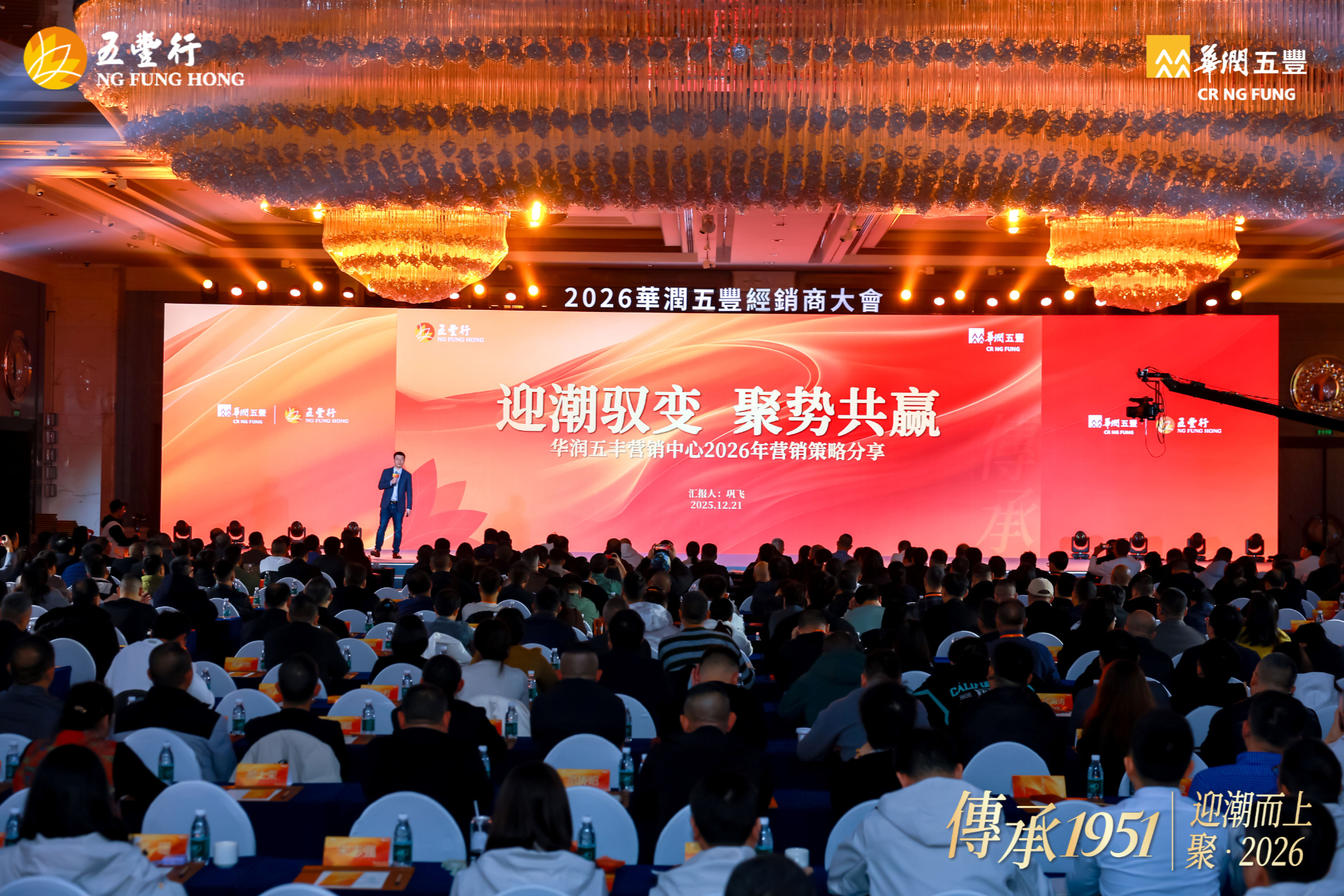 12 月 21 日,华润五丰在杭州召开 2026 年经销商大会,大会以 “传承 1951 丨迎潮而上,聚 2026” 为主题,寓意华润五丰与各经销商伙伴一起顺势而为、聚力同心,共拓食品行业新征程。华润五丰董事长原强、总经理刘明芳携管理团队,以及来自全国各地的经销商伙伴等,共计 450 余名嘉宾参加活动。